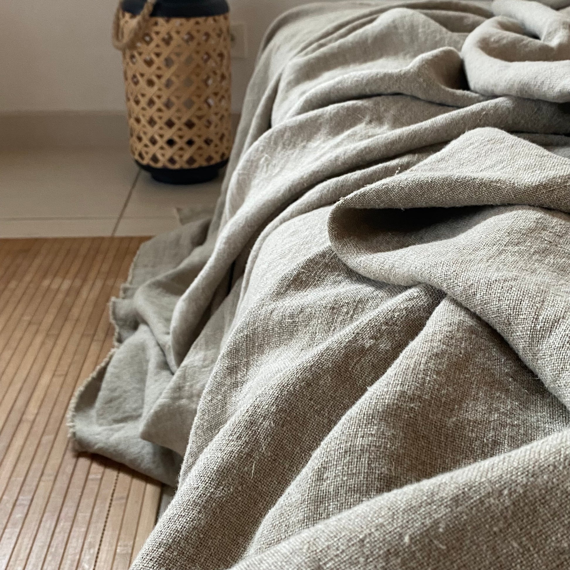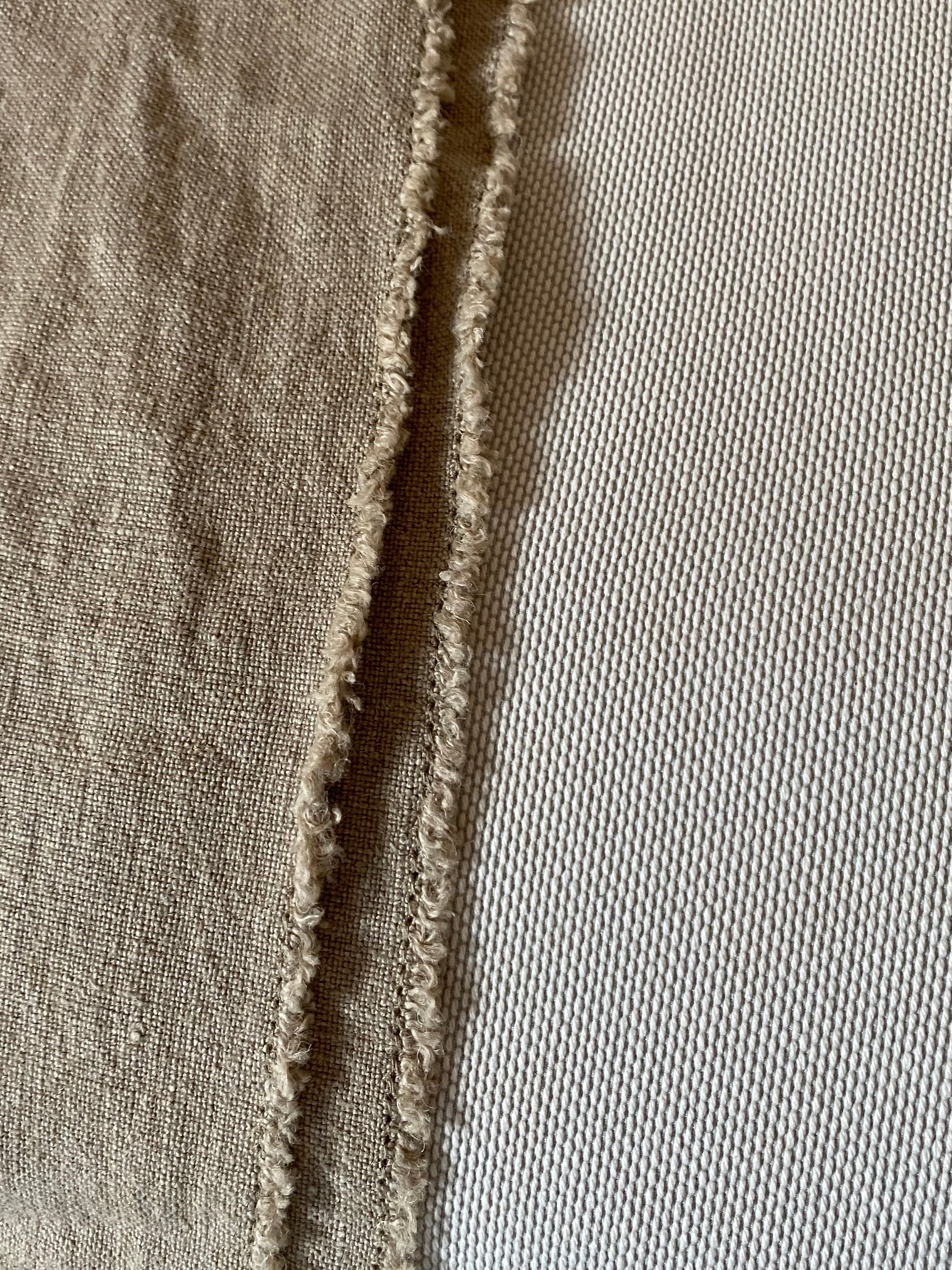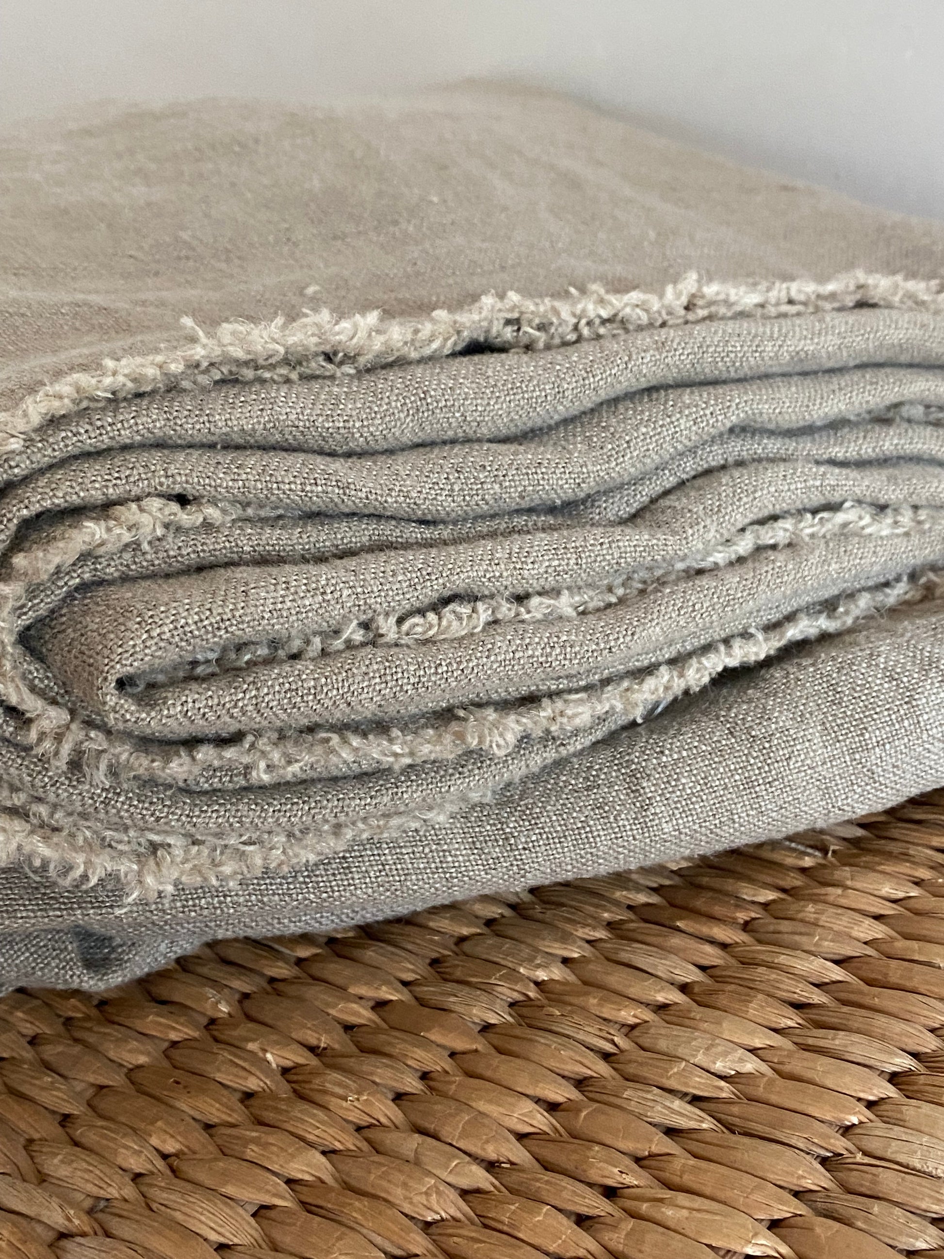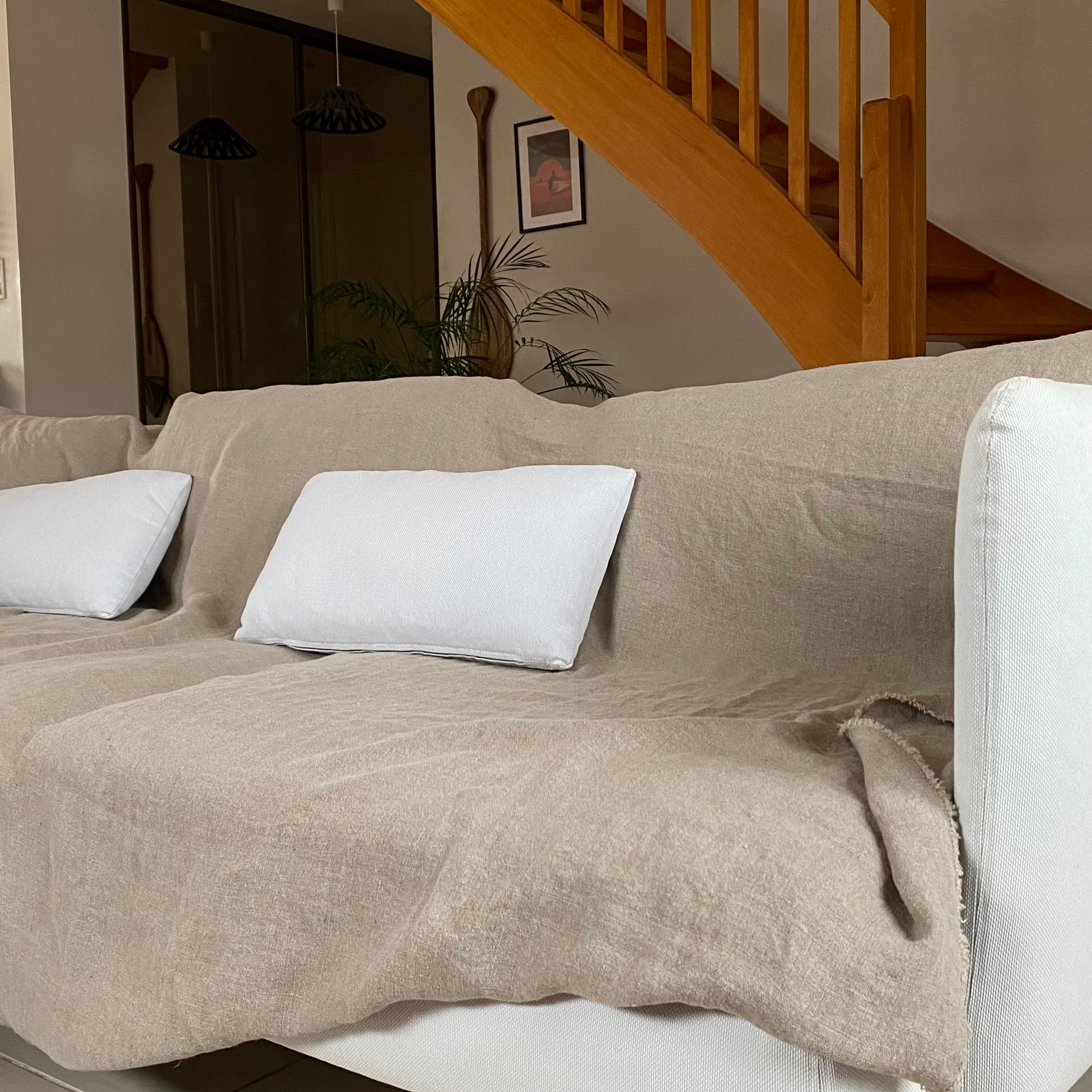 Le lin présente une texture légèrement texturée, caractéristique de cette matière noble. Sa teinte beige neutre évoque la simplicité et la sérénité, s’intégrant harmonieusement dans des intérieurs au style minimaliste, naturel ou bord de mer. Les bords sont finis avec une coupe brute subtile, apportant une touche décontractée et authentique, qui met en valeur le caractère artisanal du textile.