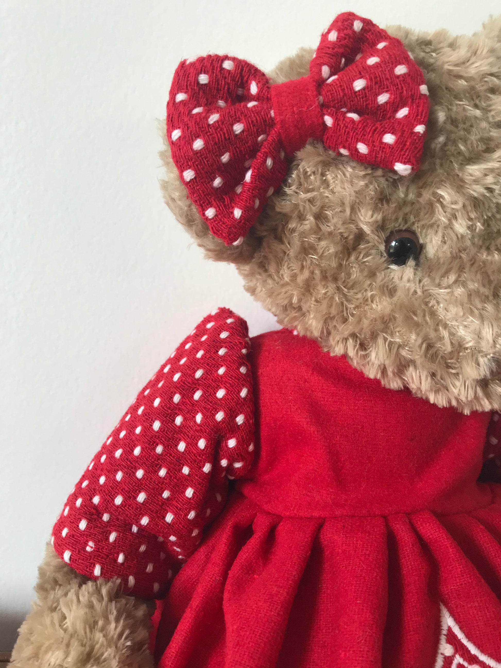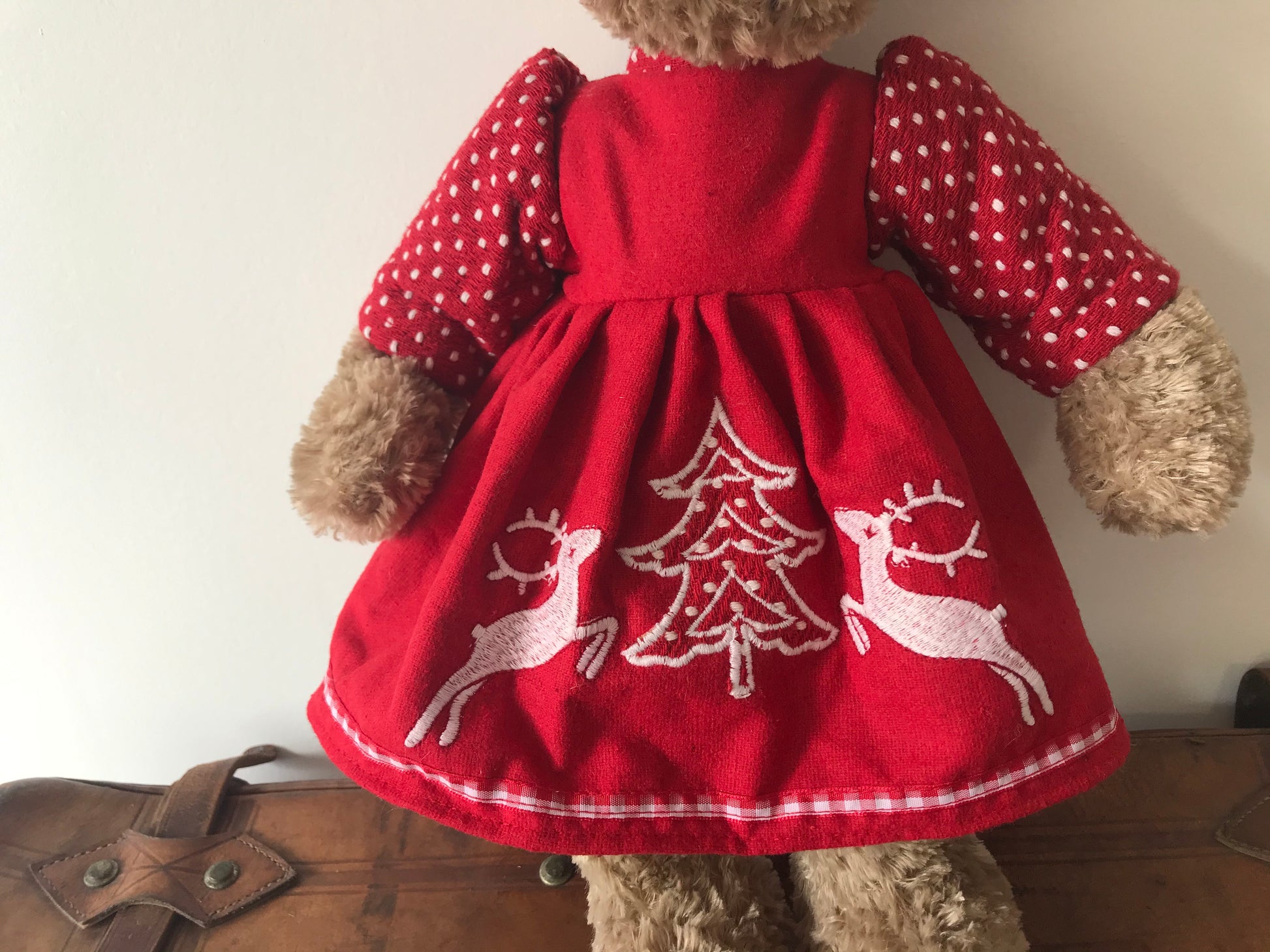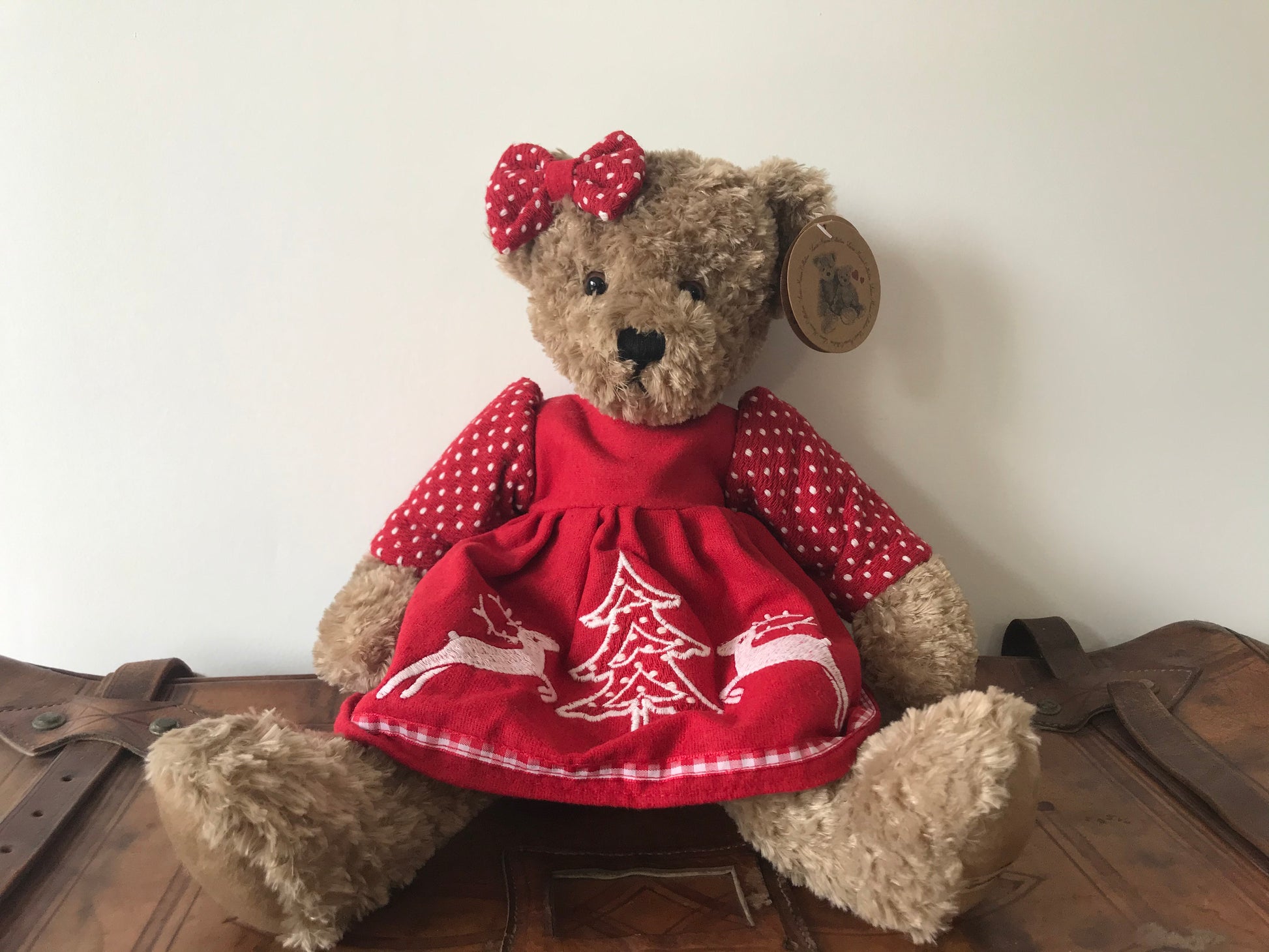 Son pelage brun clair, doux et moelleux, est accompagné d’une robe rouge ornée de motifs brodés hivernaux, avec des rennes et un sapin. Les manches et le nœud à pois blancs ajoutent une touche joyeuse et traditionnelle.