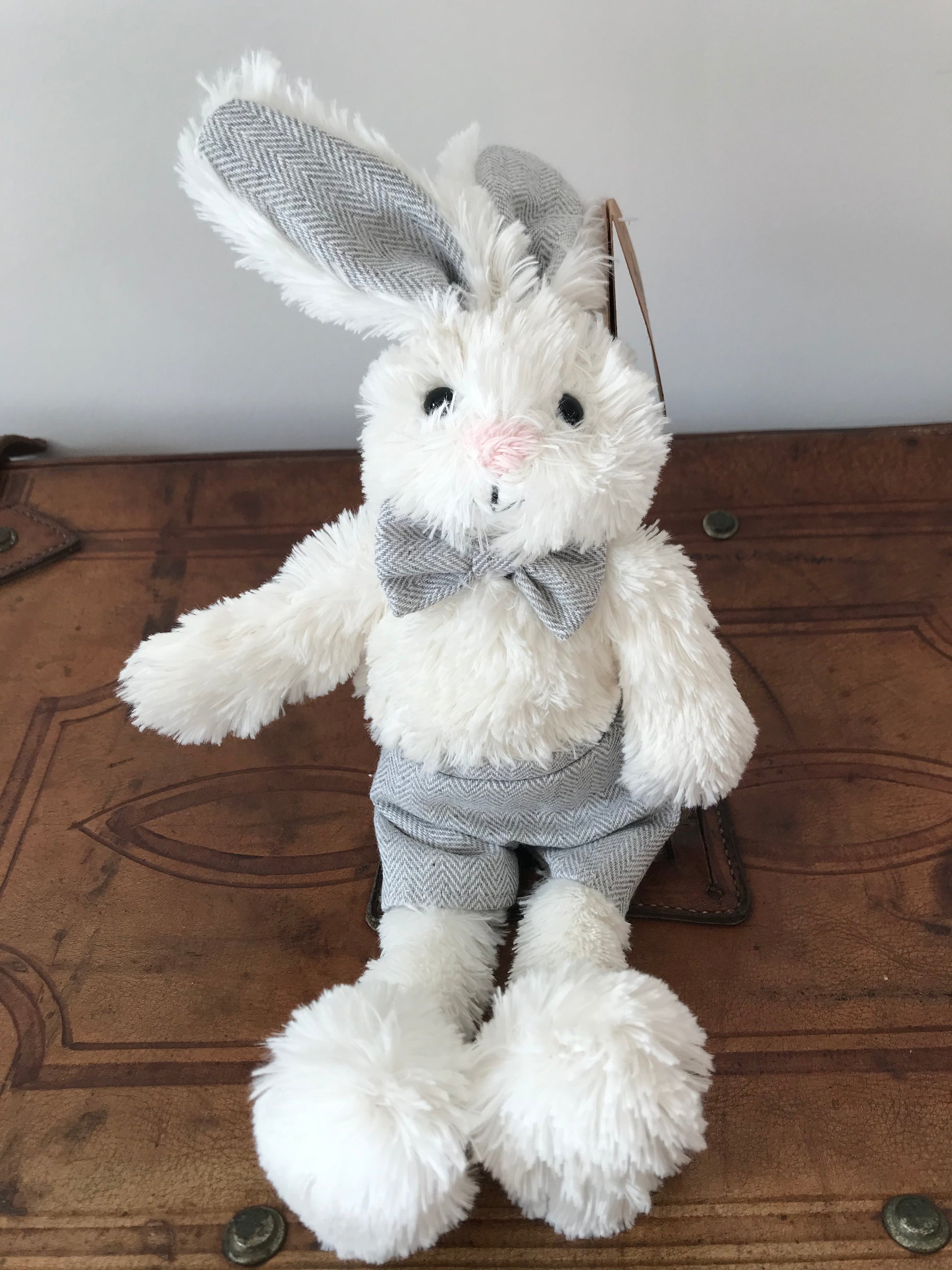 Sa fourrure blanche soyeuse, ses oreilles en tissu chevron gris et son nœud papillon raffiné en font un compagnon élégant et facile à emporter partout.