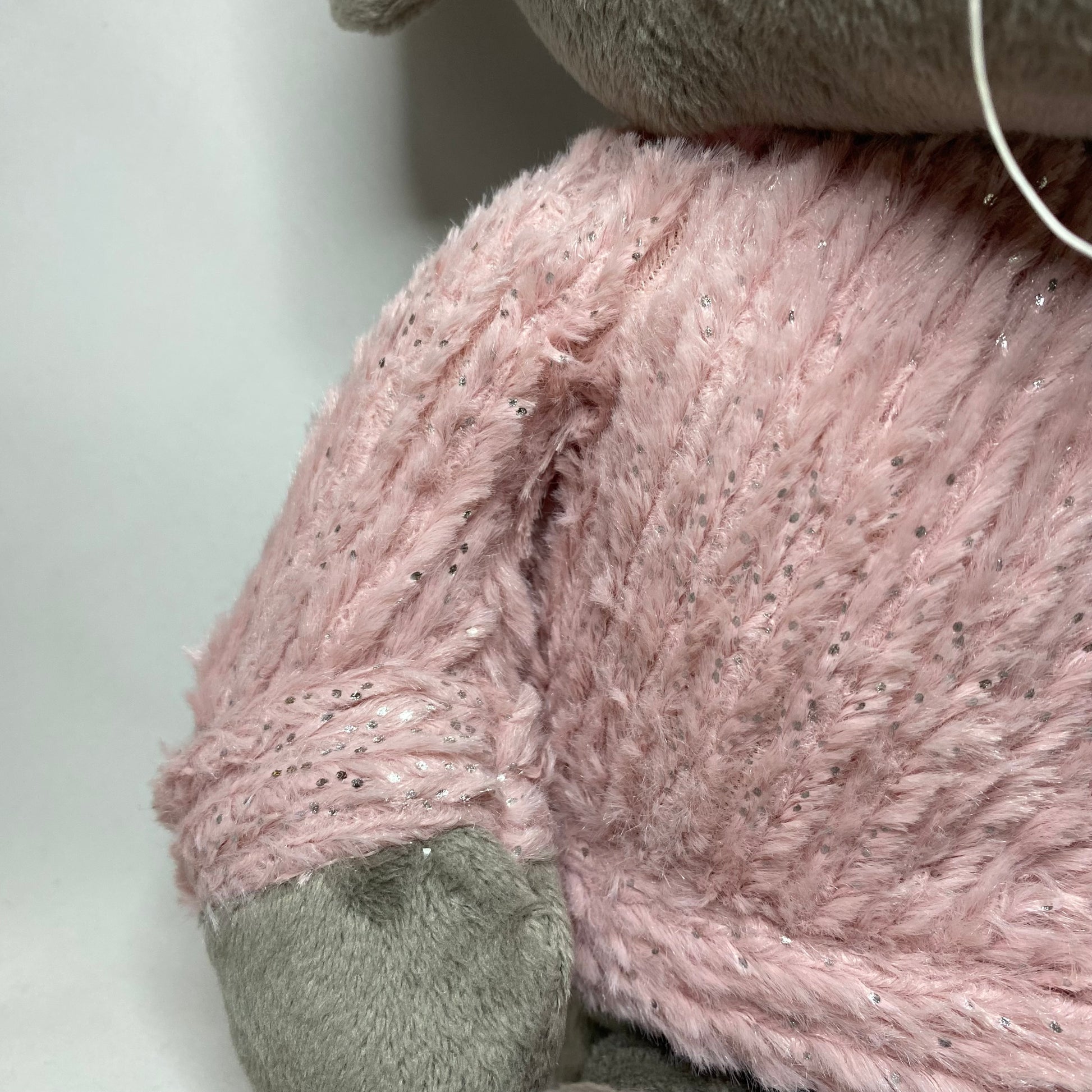 • Détails doux : Son pull rose ajoute une touche de douceur et de tendresse, contrastant agréablement avec sa fourrure grise.