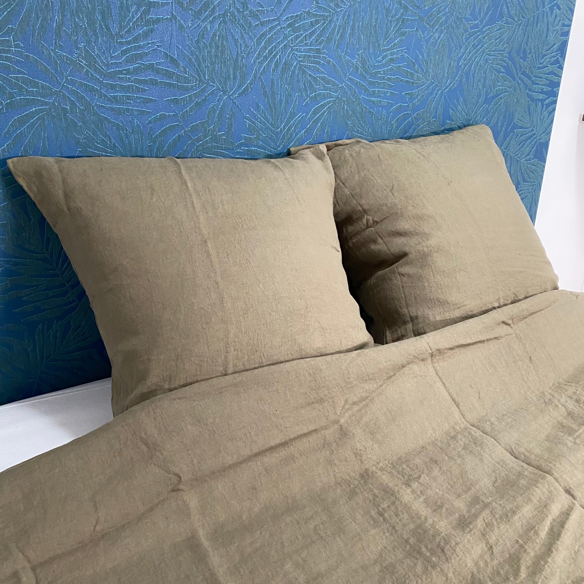 Voici la version adaptée pour une parure en lin lavé vert kaki :
