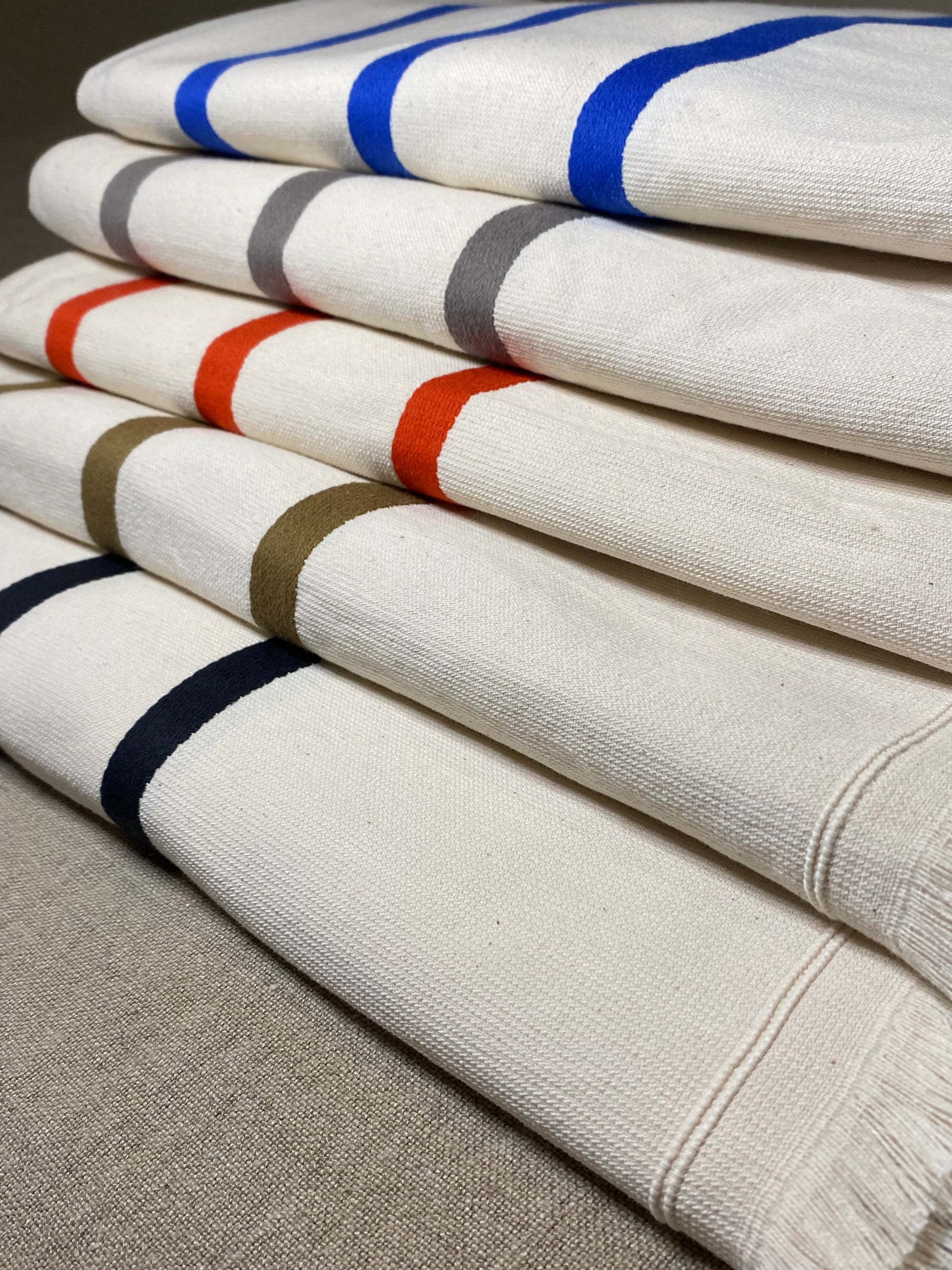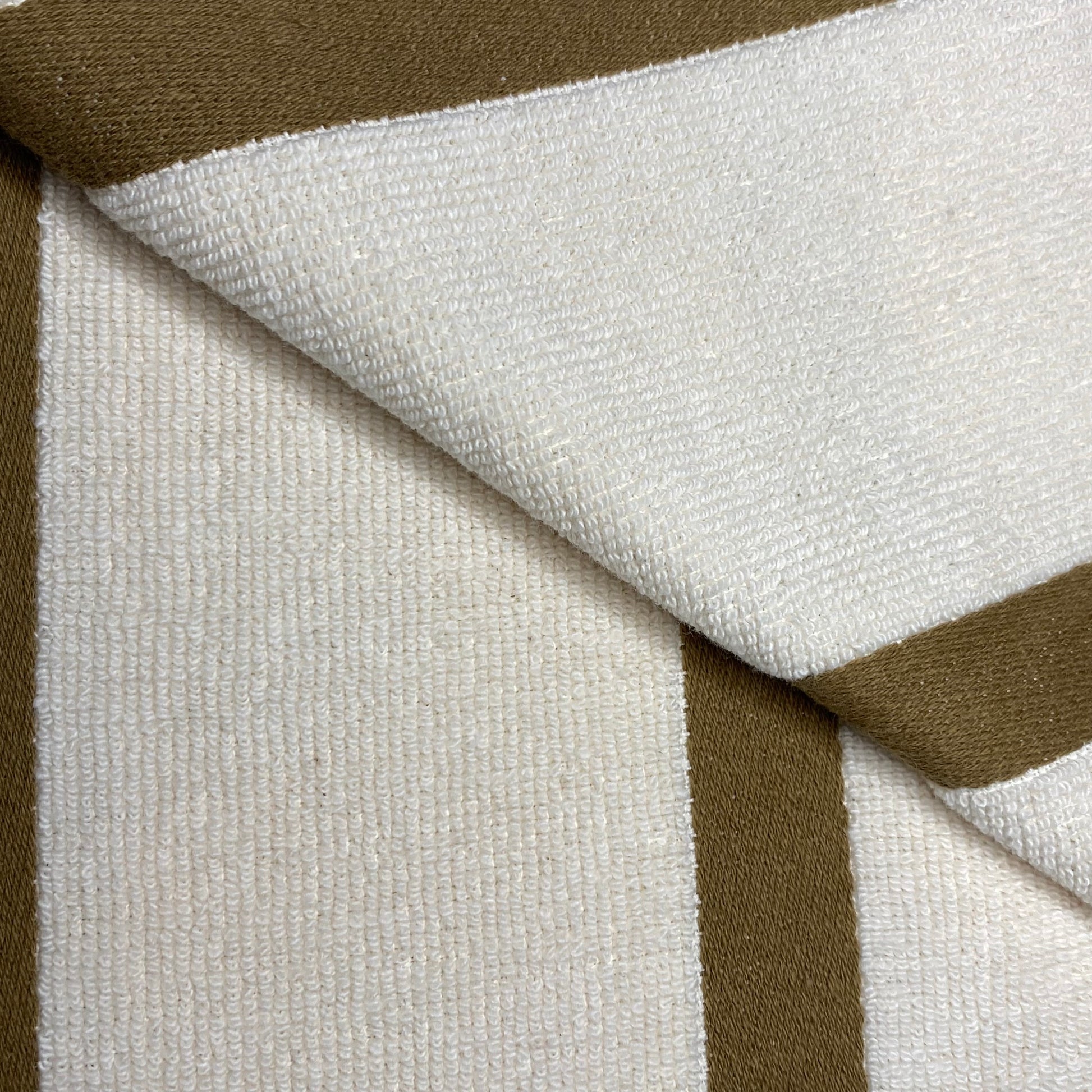 Elle arbore un élégant motif de rayures vertes camels sur fond écru , parfait pour un style classique au bord de la mer.