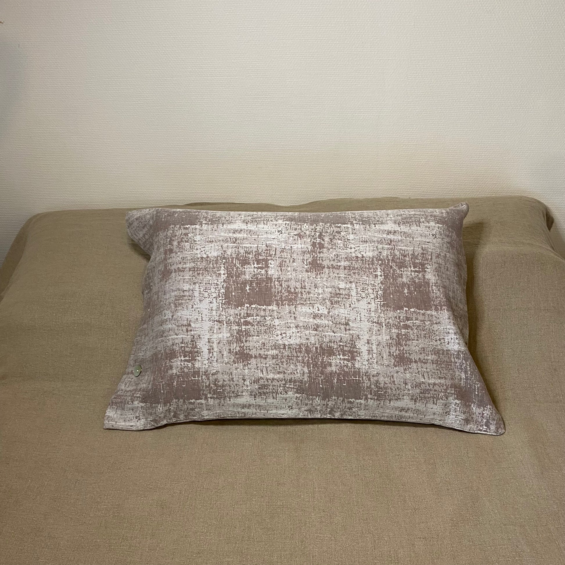 • Design uni : Les deux faces sont réalisées dans un tissu en lin et coton mauve et blanc chiné, apportant une texture douce et raffinée.