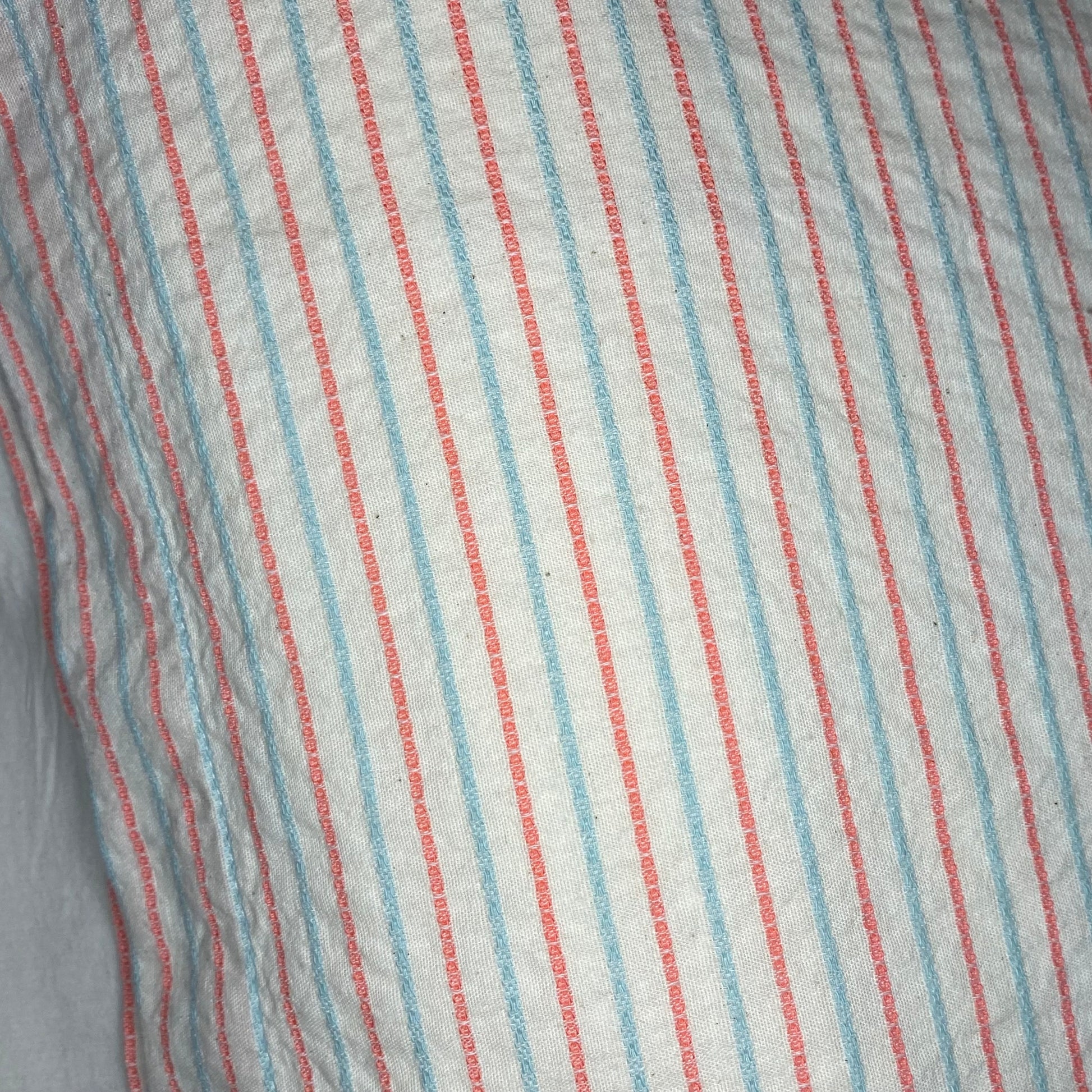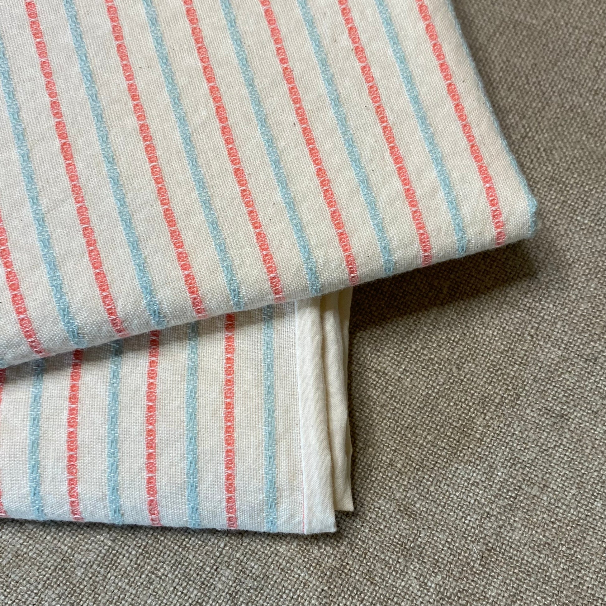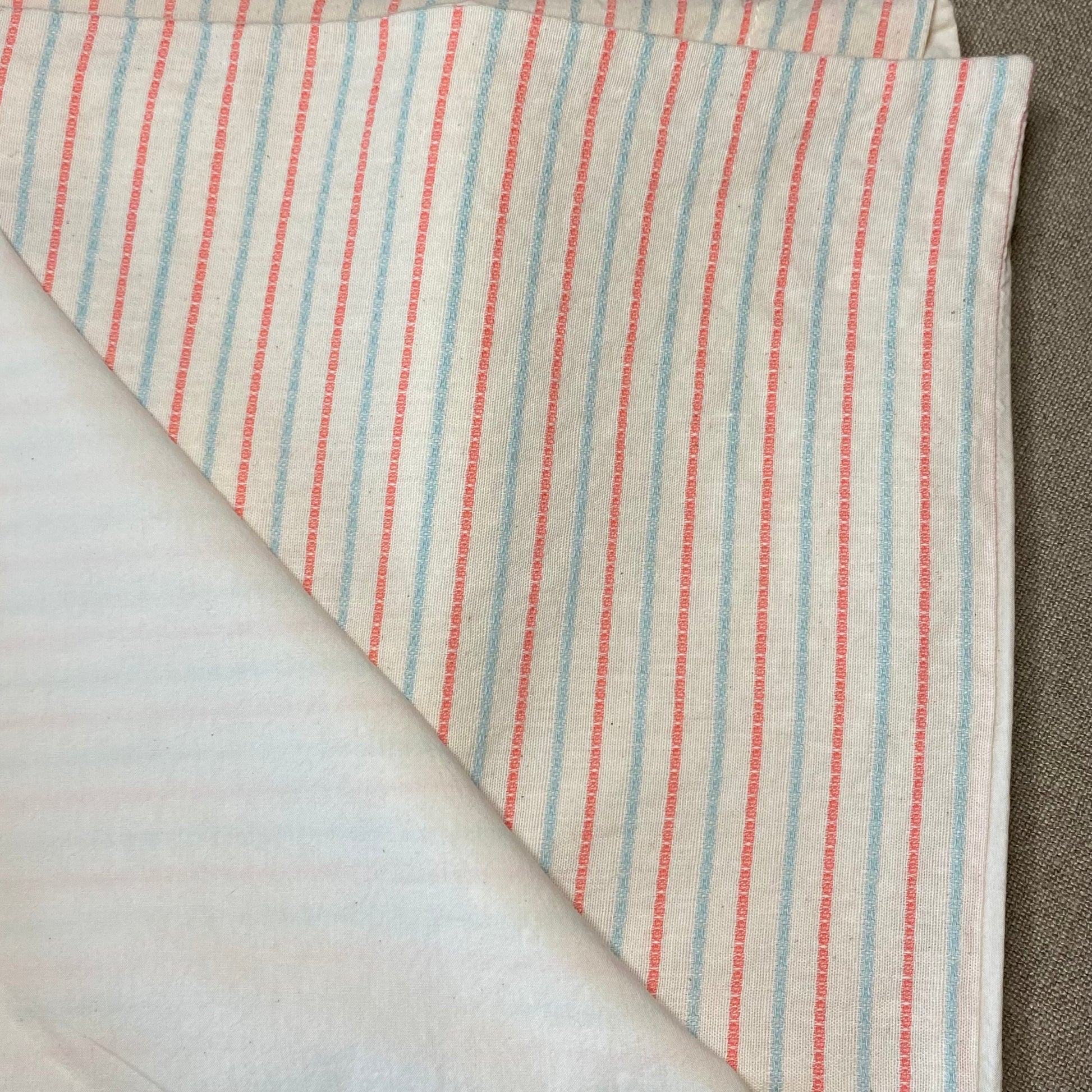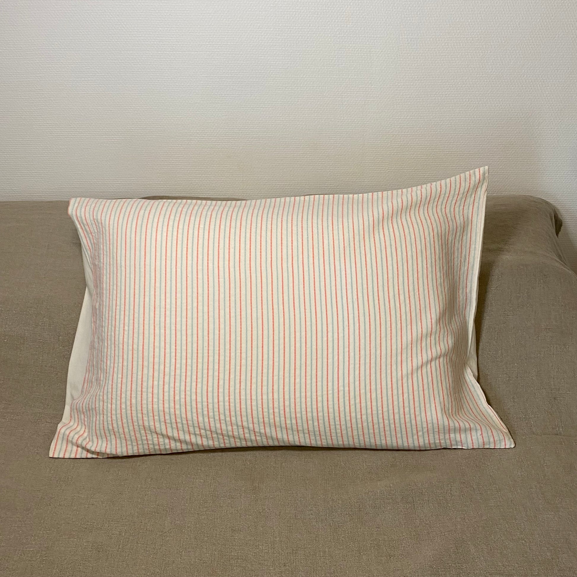 • Face en lin : Ornée de fines rayures roses et bleues sur un fond naturel, elle apporte une touche douce et colorée à votre literie.